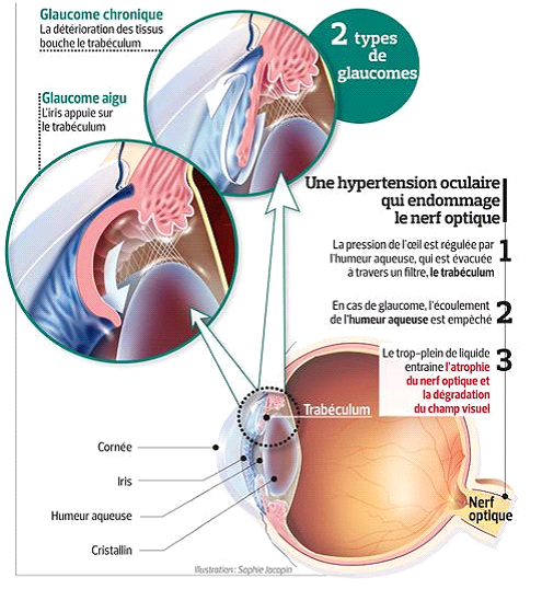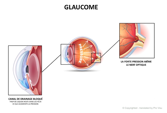 un canal qui, à son tour, le relâche dans la circulation sanguine à la surface externe de l’œil. Tout ce qui peut bloquer cette circulation normale provoque une augmentation de pression. L'augmentation de pression dans l'œil